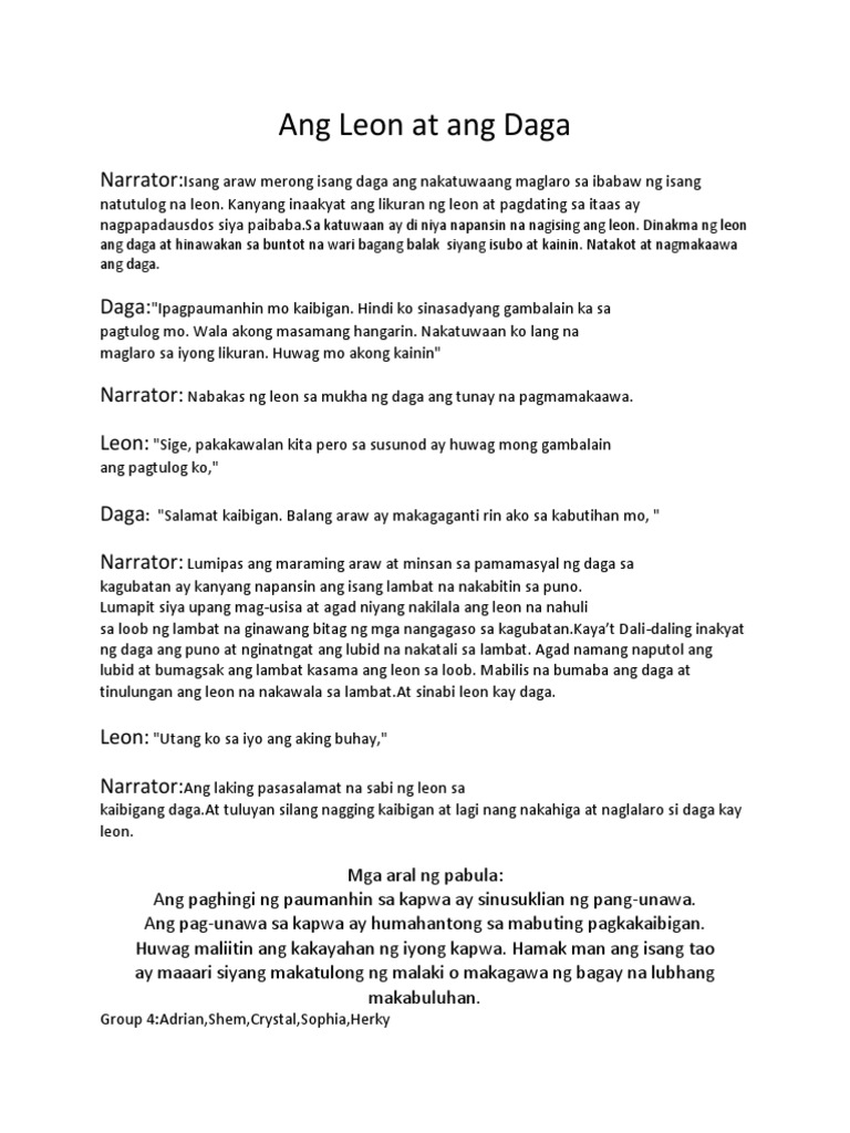- Gawain 3 - Balikan at kilalanin muli ang mga tauhan sa kwento magbigay ng mga n ng sumulat na nakapaloob dito. Basahin ang istorya ng Leon at ng Daga. October 20 2018.