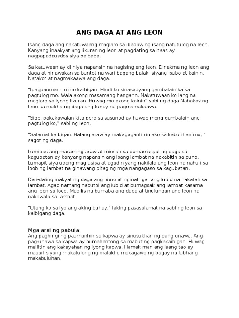 May natatanging kaisipang mahahango mula sa mga pabula sapagkat nagbibigay ng mga moral na. 11152018 TAGALOG SHORT STORIES Narito ang limang 5 halimbawa ng maikling kwento o Tagalog short stories na mapupulutan ng aral. Ang Daga at ang Leon.
