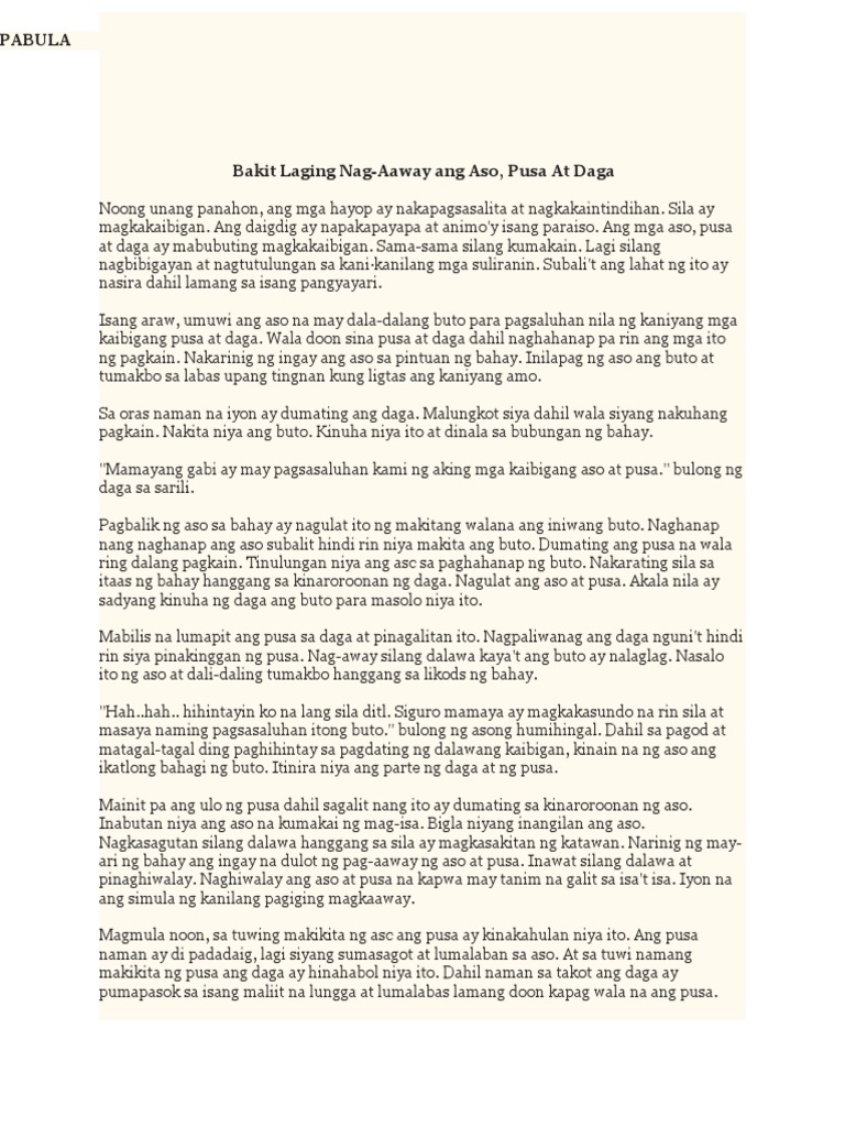 Pusa at ang daga buod. Bakit Laging Nag-aaway ang Aso Pusa at Daga by Godofredo Moring Jr. Naging bahagi na ng buhay nila ang pag tutulungan. Inilapag ng aso ang buto at tumakbo sa labas upang tingnan kung ligtas ang kaniyang amo.